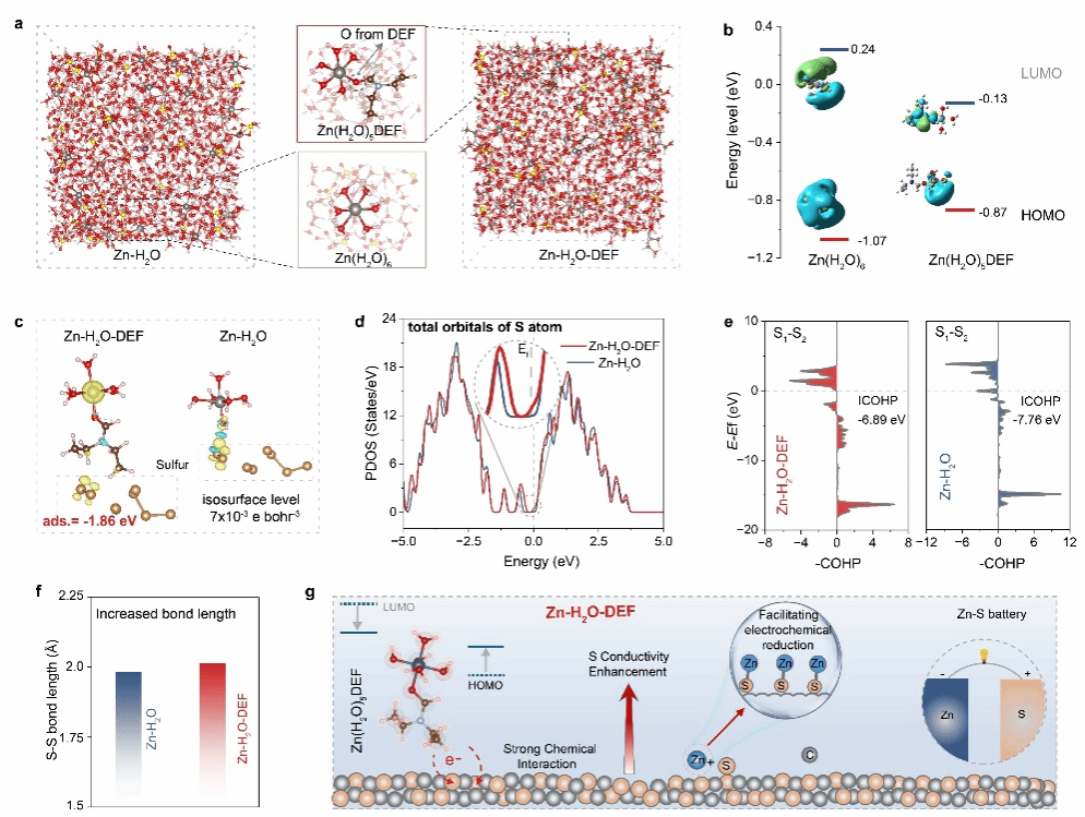 水系锌-硫电池具备高安全、低成本、高容量(理论容量>1600 mAh g-1)等特点,在大规模储能领域极具应用潜力。然而,由于硫的导电性差、电池固-固反应动力学缓慢,电解液中的水分子易分解,导致电池放电电压低、循环稳定性差,阻碍其实际应用。为解决这些问题,研究团队采用共溶剂策略,调控锌离子在电解液中的溶剂化结构,促进溶剂化锌离子与硫正极间相互作用,进而加速硫正极的还原反应动力学。本文首先以N,N-二乙基甲酰胺(DEF)作为共溶剂研究模型,形成[Zn(H2O)5DEF]2+溶剂化结构加速硫电极-电解液界面反应动力学。此外,由于DEF的强给电子效应,增强了硫电极的固有电子导电性。DEF提供的电子占据硫原子的反键轨道,增加其电子云密度并引发原子间静电排斥,削弱S-S键相互作用,从而促进硫快速转化为ZnS。所组装的锌-硫电池实现了0.8 V的稳定放电平台以及1583 mAh·g-1的高比容量,经过2000次循环后容量保持率为85%。组装了Ah级软包电池,成功进行概念验证,电池性能优于以往文献报道的水系锌硫电池。同时,团队结合机器学习与电化学性能测试结果,对18种有机共溶剂进行研究。首次提出供体数(DN)和最高占据分子轨道(HOMO)能级是预测电池性能的关键描述符。借助此描述符,可快速筛选高性能水系锌硫电池共溶剂,显著提高研发效率。