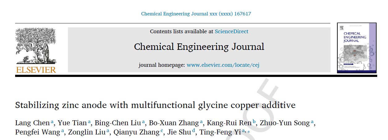 近日,东北大学秦皇岛分校伊廷锋教授指导的本科生科创团队在水系锌离子电池领域取得重要进展,研究成果“Stabilizing zinc anode with multifunctional glycine copper additive(多功能甘氨酸铜添加剂稳定锌阳极)”发表于化学工程领域国际著名刊物Chemical Engineering Journal(中科院一区)。秦皇岛分校材料科学与工程专业2022级本科生陈浪为第一作者,伊廷锋教授为通讯作者,东北大学秦皇岛分校为第一完成单位。