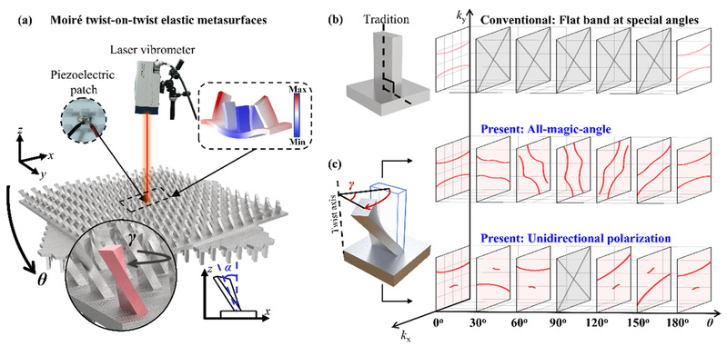 在“扭曲-堆-扭曲”弹性摩尔超表面上实现的单向极化和全方向“魔角”;a,“扭曲-堆-扭曲”弹性摩尔超表面。b,传统的柱状单胞和对应摩尔超表面产生的部分“魔角”;c,扭曲状单胞和对应摩尔超表面产生的单向极化以及全方向“魔角”