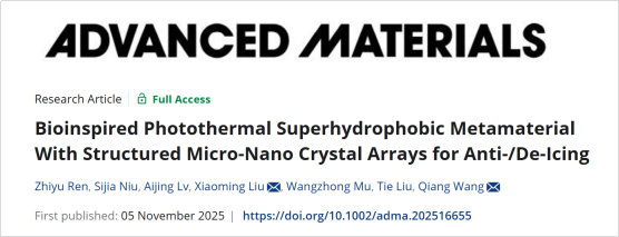 近日,东北大学王强、刘晓明团队在光热超疏水超材料领域取得重要进展。相关成果以Bioinspired Photothermal Superhydrophobic Metamaterial With Structured Micro-Nano Crystal Arrays for Anti-/De-Icing为题发表在国际权威学术期刊Advanced Materials(影响因子26.8)。东北大学为该论文的第一作者单位,东北大学冶金学院博士研究生任志宇为第一作者,刘晓明副教授与王强教授为共同通讯作者。
