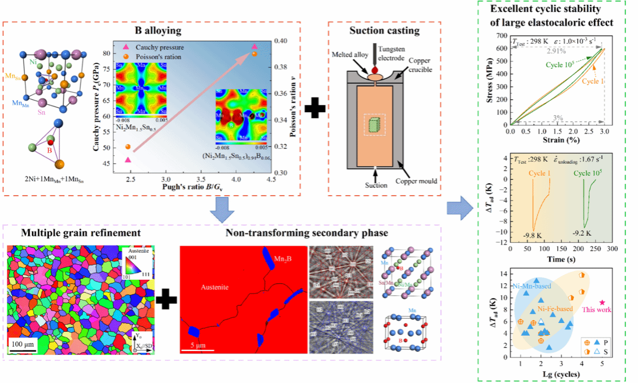 研发出兼具大弹性热效应与优异弹热循环稳定性的Ni-Mn-Sn基形状记忆合金,对于推动固态弹热制冷技术发展至关重要。研究团队首先利用第一性原理计算揭示了微合金化硼(B)原子的优先占位特征,并通过弹性常数与差分电荷密度分析阐明了硼合金化增强合金力学性能的内在机制。研究进一步提出一种有效的微观结构调控策略——将吸铸工艺与硼合金化协同结合,该策略可实现多重晶粒细化并引入非相变第二相。此方法显著改善Ni-Mn-Sn基合金的力学性能与弹热循环稳定性。其中,研究获得的细晶(Ni43.5Mn46Sn10.5)98.5B1.5合金在298 K下3%压应变卸载条件下实现了高达9.8 K的绝热温变,并在288 K至368 K的宽温区内保持优异的超弹性与稳定的弹热效应表现。更为突出的是,该合金在600 MPa应力下经10⁵次循环后弹热效应几乎无衰减,其循环稳定性显著优于目前已报道的大多数Ni-Mn基及Ni-Fe基磁致形状记忆合金。这一成果为高性能固态制冷材料的研发提供了新的思路与技术路径。