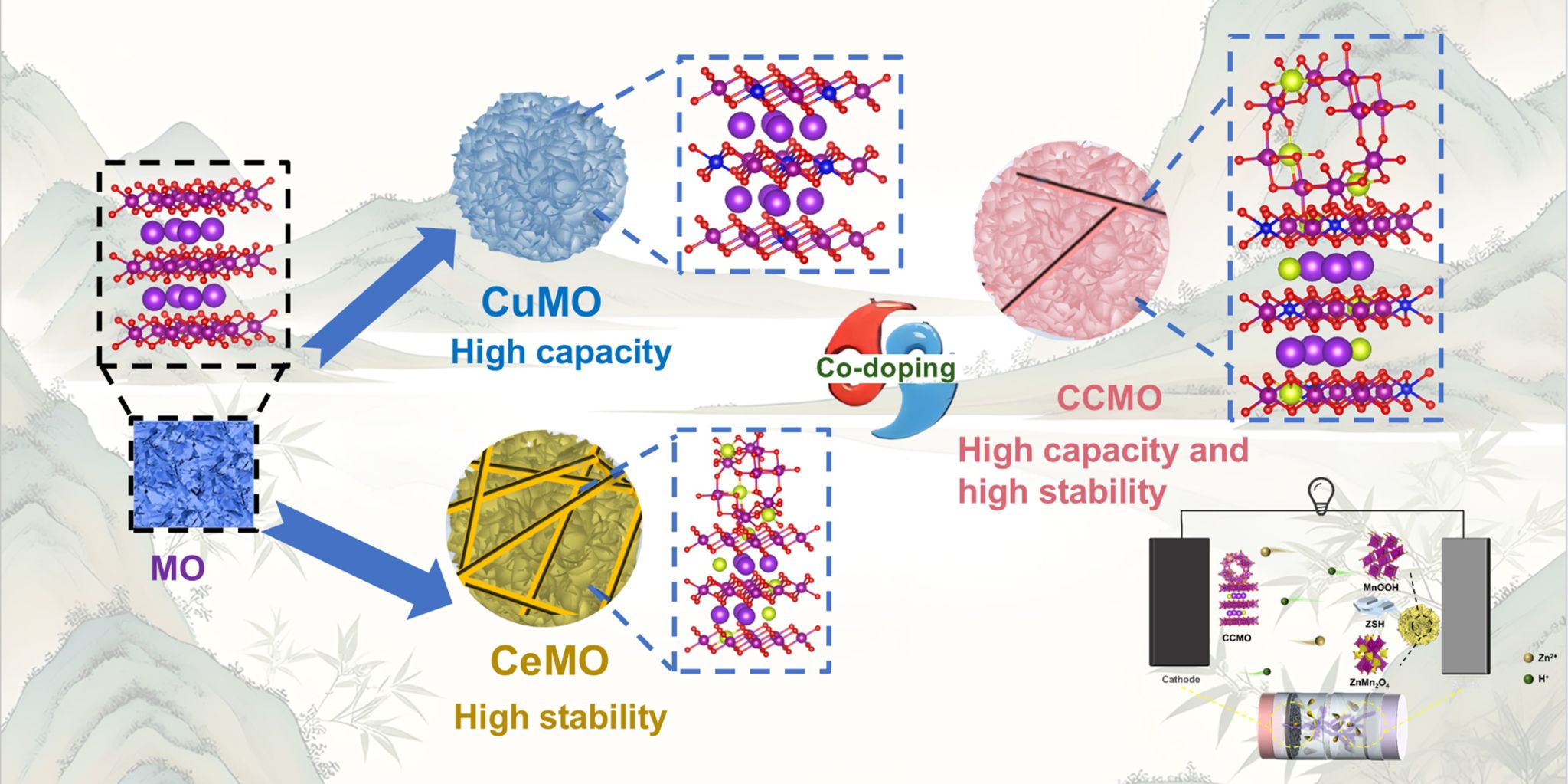 基于此,作者团队创新性地提出在层状δ-MnO2中引入Ce3+与Cu2+,构建了具有δ/α-MnO2异质结构的正极材料。理论计算与实验表明,Cu2+替代Mn可激活Mn4+/Mn2+氧化还原对,实现局部双电子转移,显著提高比容量;Ce3+掺入诱导部分δ-MnO2向α-MnO2转变,形成具有内建电场的异质结构。该结构借助α相刚性骨架与δ相柔性锌存储层构成的“刚柔”体系,有效抑制层间坍塌与体积膨胀,防止应力集中。最终,CCMO正极实现455.4 mAh g-1的高容量(0.2 A g-1)、优异倍率性能和长循环稳定性(2 A g-1下1500次循环容量保持率95%)。