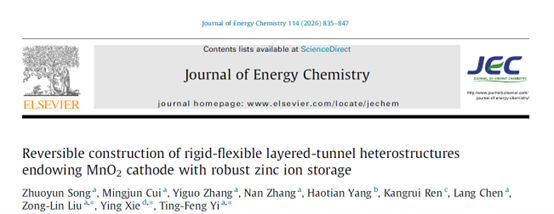 近日,东北大学秦皇岛分校资源与材料学院伊廷锋教授指导的本科生科创团队在水系锌离子电池正极材料领域取得重要进展,研究成果“Reversible construction of rigid-flexible layered-tunnel heterostructures endowing MnO2 cathode with robust zinc ion storage(可逆构建刚柔层状隧道异质结构赋予MnO2正极稳健的锌离子存储性能)”发表于中国科技期刊卓越行动计划领军期刊Journal of Energy Chemistry(中国科学院一区)。秦皇岛分校材料科学与工程专业2022级本科生宋卓云为本文的第一作者,分校伊廷锋教授、柳宗琳博士、黑龙江大学谢颖教授为论文通讯作者,东北大学秦皇岛分校为第一完成单位。
