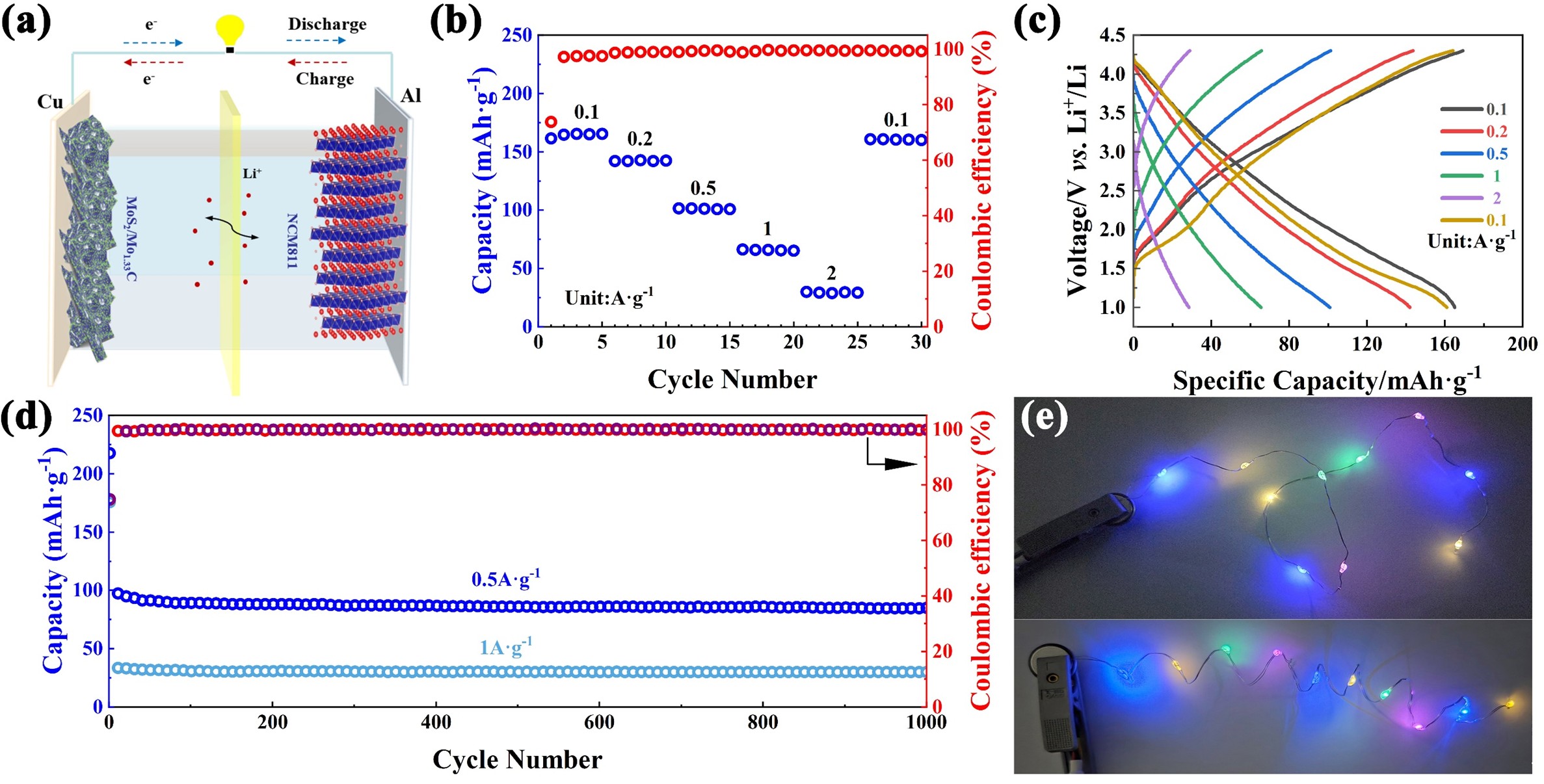 东北大学团队以原位硫化法融合 MoS2与 Mo1.33C i-MXene优势,用硫脲作硫化剂,在氩气中加热至 400-700℃,让 MoS2原位生长在 Mo1.33C i-MXene表面形成3D 褶皱结构,500℃的 S-500 性能最优。比容量在低电流下达 884.6 mAh·g-1,高电流时仍存 746.2 mAh·g-1,循环稳定性佳。与商用阴极组成的全电池循环 1000 次容量保持率 84%,实用价值高。