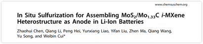 近日,东北大学材料科学与工程学院崔伟斌教授团队在二维i-MXene材料研究领域取得重要进展。相关研究以In Situ Sulfurization for Assembling MoS2/Mo1.33C i-MXene Heterostructure as Anode in Li-Ion Batteries为题,在国际知名期刊ChemSuschem发表重要研究成果。材料科学与工程学院博士研究生陈昭辉为本文第一作者,材料电磁过程教育部重点实验室、材料物理学科崔伟斌教授为本文通讯作者,东北大学为唯一单位。我校分析测试中心为本工作提供硬件支撑,国家自然科学基金、中央高校基本科研业务费、国家青年人才项目、省部企业联合基金等支持。