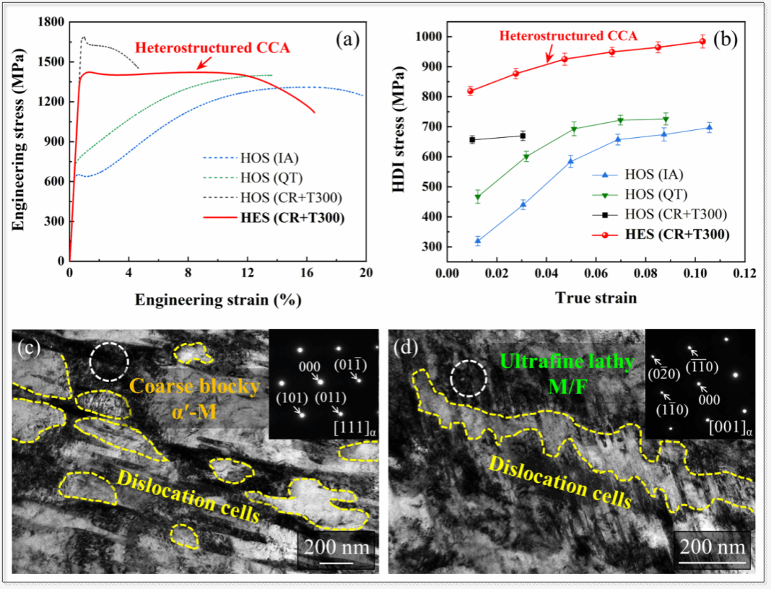 “多重异构体心立方合金的协同形变强韧化策略”研究成果,设计并制备出一种具有独特多重异质结构的Fe69.4Mn10Co10Cr10N0.6 (at.%)体心立方 合金,通过激活协同形变机制实现了优异的强塑性匹配。该合金主要包含由层状排列的亚微米级的超细板条晶组成的微米级块状α′-马氏体区、亚微米级超细铁素体板条区、亚微米级α′-马氏体和铁素体双相混合区以及位于二者相界面处或铁素体晶粒内部的富Cr和N的纳米析出相。这种由铁素体和α′-马氏体组成的层状异质结构是通过温轧、临界区退火和冷轧处理得到的,之后在回火及水淬过程中先后发生的奥氏体逆转变和马氏体转变导致显著的几何必需位错形成。上述独特的多重异质结构不仅贡献于合金由非均匀形变诱导的强化和硬化,而且增强了动态应变时效硬化,使经300 °C回火后的材料在室温拉伸试验中表现出优异的屈服强度 (1423 MP)和均匀延伸率 (10%)组合。高屈服强度主要来源于密度高达1015 m-2数量级的位错。形变过程中可动位错的滑移和位错胞形成促进了均匀塑性变形。