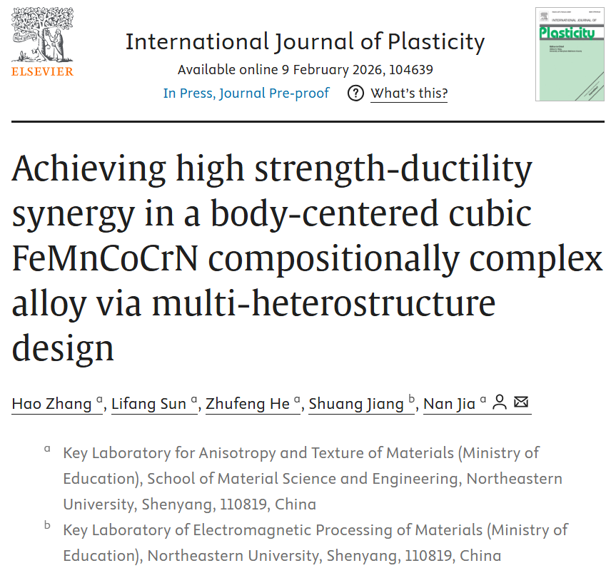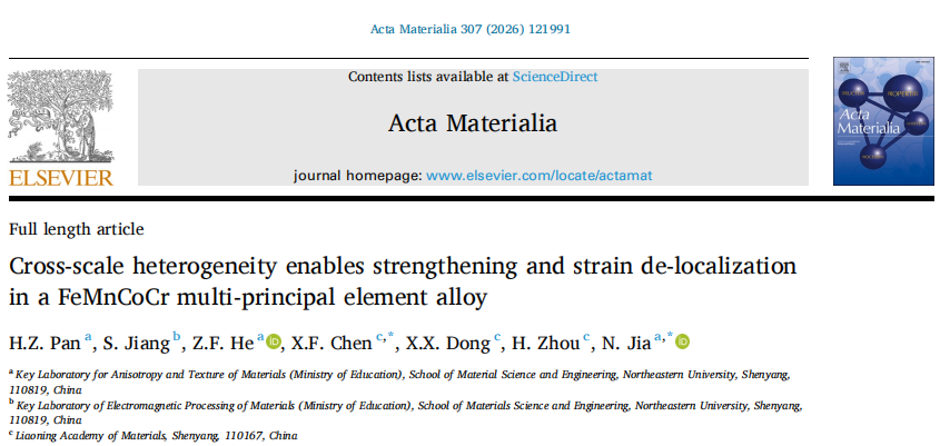 近日,东北大学材料科学与工程学院贾楠教授课题组在高强韧性异构高熵合金研究领域连续取得进展,相关成果分别发表于材料顶刊Acta Materialia(论文题目:Cross-scale heterogeneity enables strengthening and strain de-localization in a FeMnCoCr multi-principal element alloy)和International Journal of Plasticity(论文题目:Achieving high strength-ductility synergy in a body-centered cubic FeMnCoCrN compositionally complex alloy via multi-heterostructure design)。东北大学为第一完成单位,博士研究生潘海正、张浩分别为论文第一作者,辽宁材料实验室为合作研究单位。