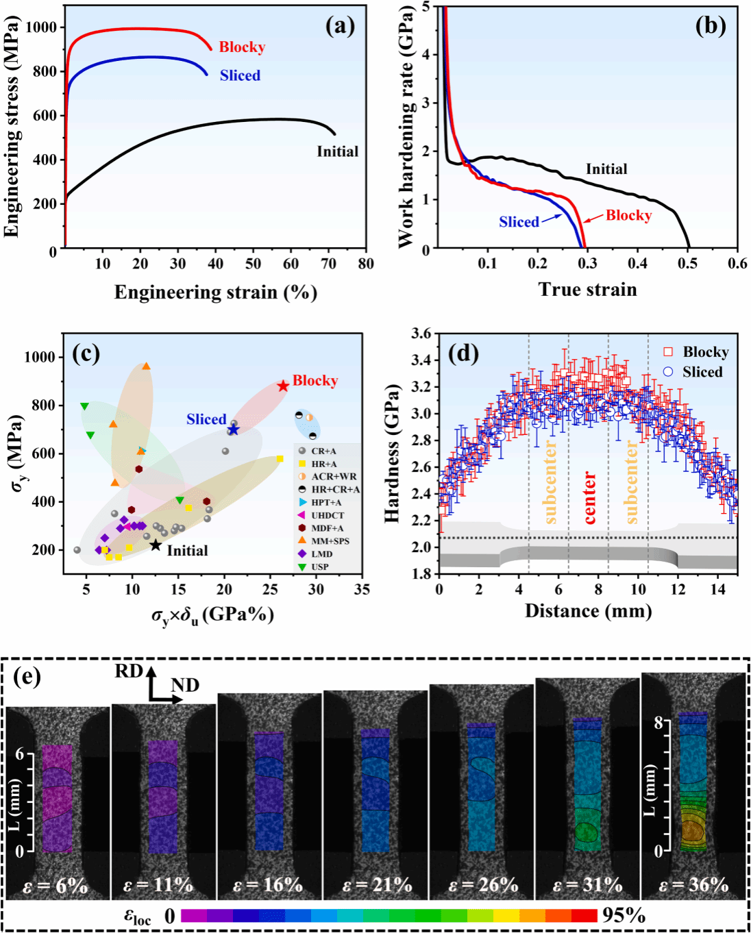 “高强韧面心立方合金的跨尺度异构组织构筑 ”研究成果,通过“三轴循环压缩+块体短时退火”的创新工艺,制备出具有宏观-晶粒-纳米跨尺度异构材料。材料内部形成梯度再结晶分布:高应变中心区域含13.3-18.1%再结晶晶粒与密集位错,低应变次中心区域再结晶比例为11.6-14.5%。在塑性变形过程中,不同样品位置和各位置的再结晶、未再结晶区依次激活塑性变形机制,促进应变在宏观样品和晶粒尺度的连续传递,有效抑制了局部颈缩和塑性失稳。与此同时,持续激活的位错滑移、层错、孪晶和双向相变,使材料在呈现高屈服强度(880 MPa)的同时,仍保持36%的断裂延伸率。