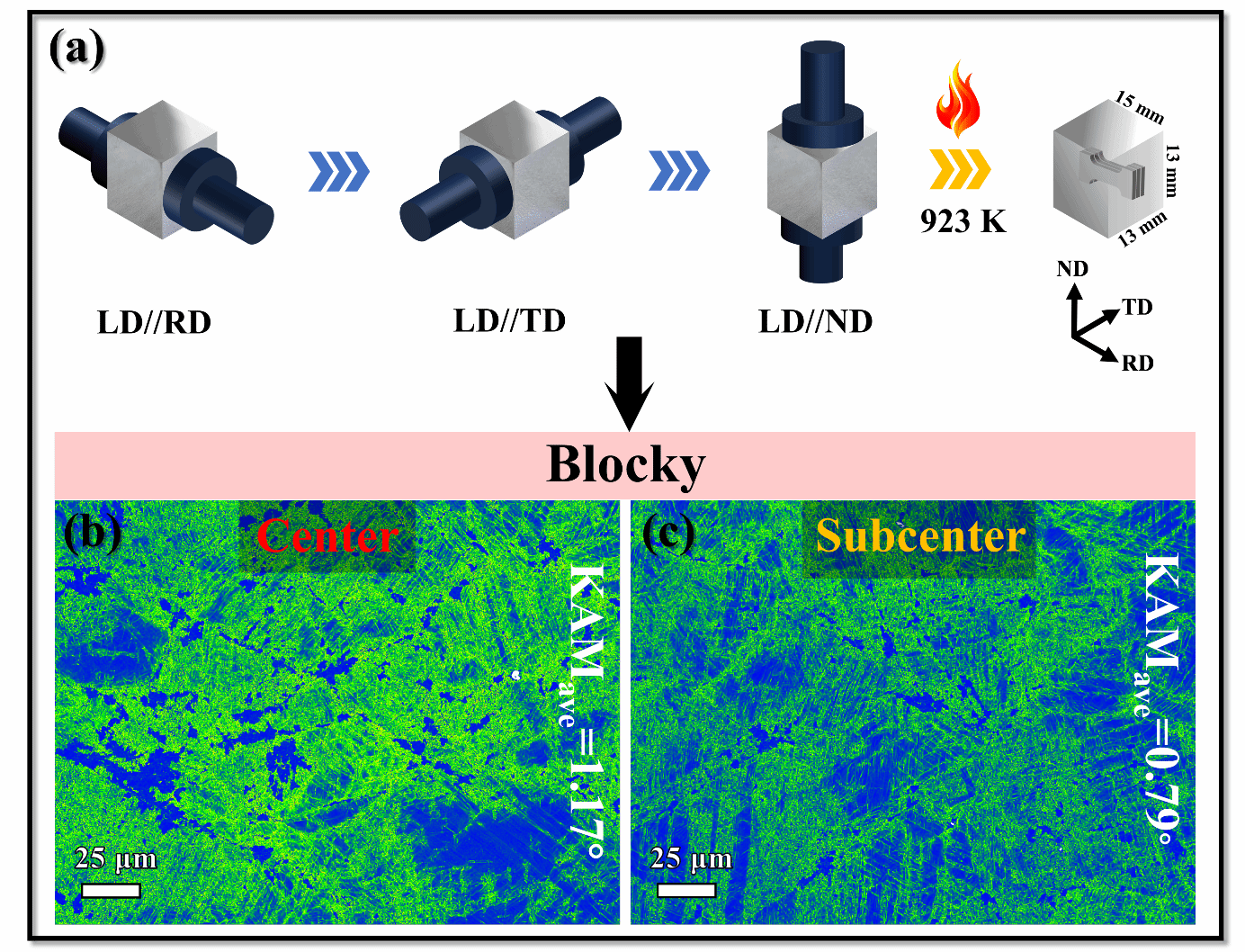 图1 “三轴循环压缩+块体短时退火”工艺示意图和材料不同位置的KAM图
