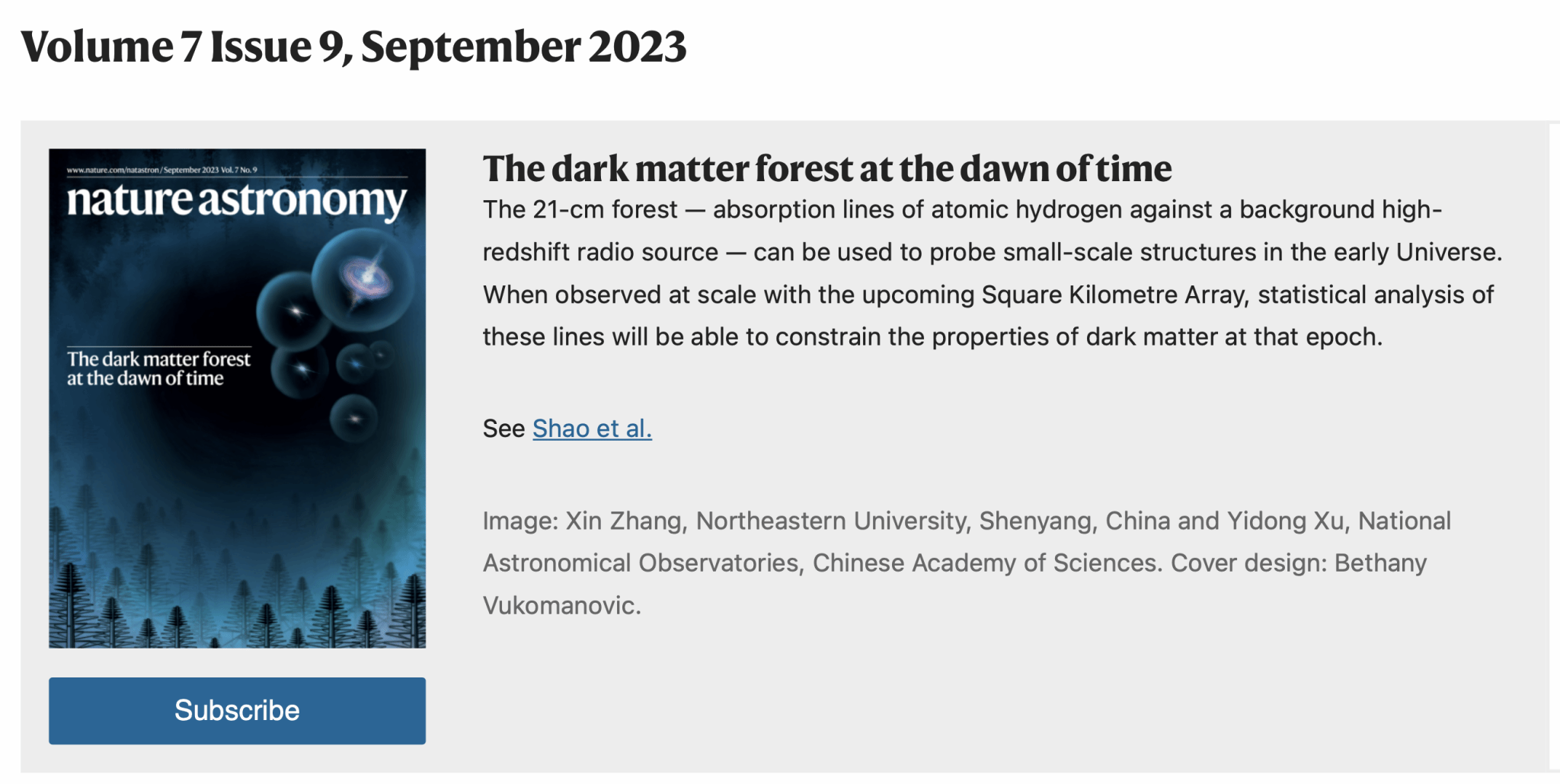 9 月 20 日,东北大学和中科院国家天文台联合团队(张鑫-陈学雷团队)的一项宇宙学研究的重大成果在国际顶级期刊《自然-天文》(Nature Astronomy)正式发表,并被该期刊遴选为当期的封面论文。这是国内天文学界不多见的《自然-天文》封面论文。论文第一作者为东北大学博士生邵悦,通讯作者为国家天文台徐怡冬副研究员、东北大学张鑫教授和国家天文台/东北大学陈学雷研究员。