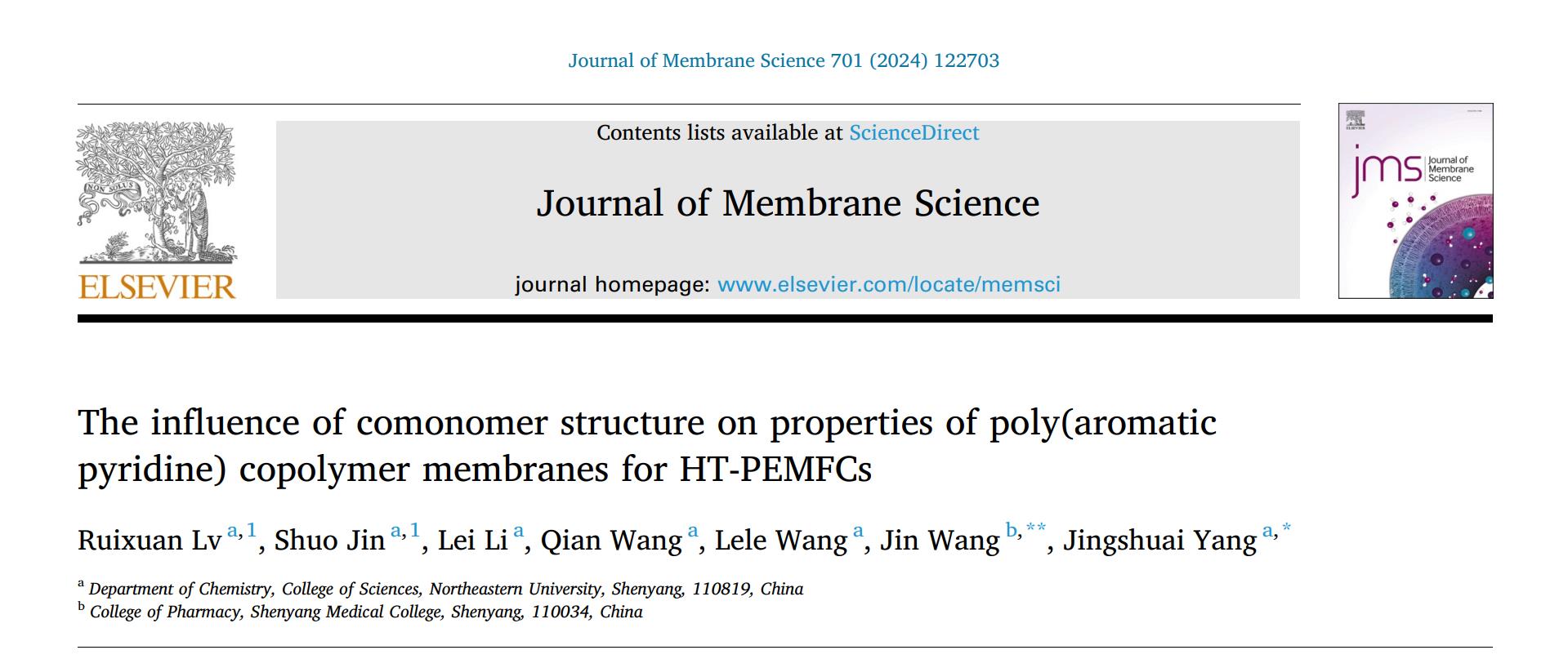 近日,东北大学理学院杨景帅副教授课题组在Journal of Membrane Science期刊上发表了题为“The influence of comonomer structure on properties of poly(aromatic pyridine) copolymer membranes for HT-PEMFCs”的研究论文。理学院应用化学专业2021级本科生吕睿轩与金朔为共同第一作者,东北大学为该论文第一作者单位,通讯作者为杨景帅。