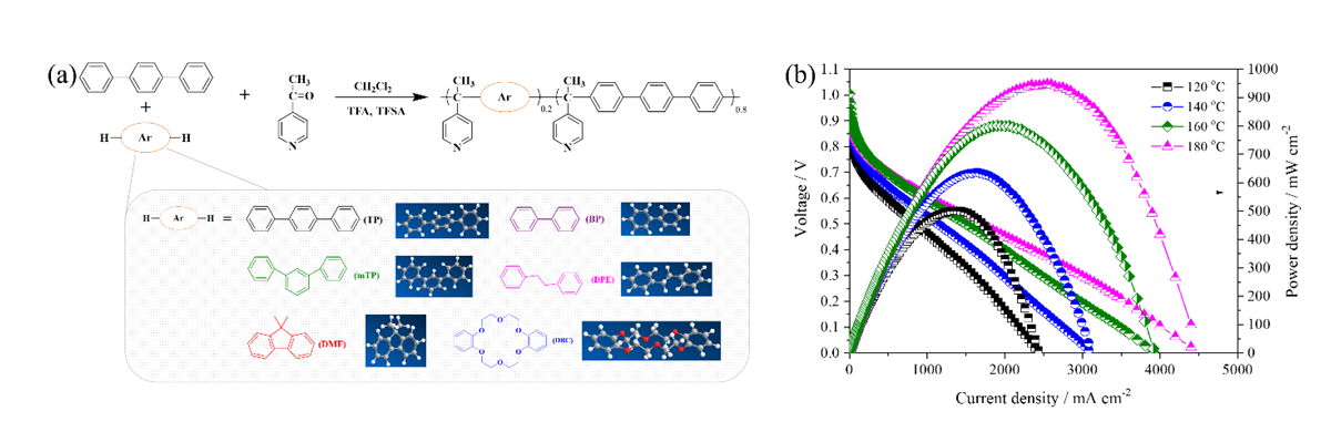 图二、(a) P(TP-co-x)聚合物的化学结构;(b) P(TP-co-DMF)/194%PA膜组装的燃料电池性能