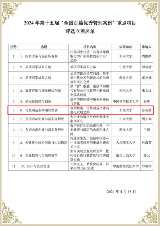 近日,工商管理学院孙新波教授获批第十五届“全国百篇优秀管理案例”重点项目,立项题目为“富创精密:传统制造企业高端化发展之路”,是学校首次获批主持“全国百篇优秀管理案例”重点项目。