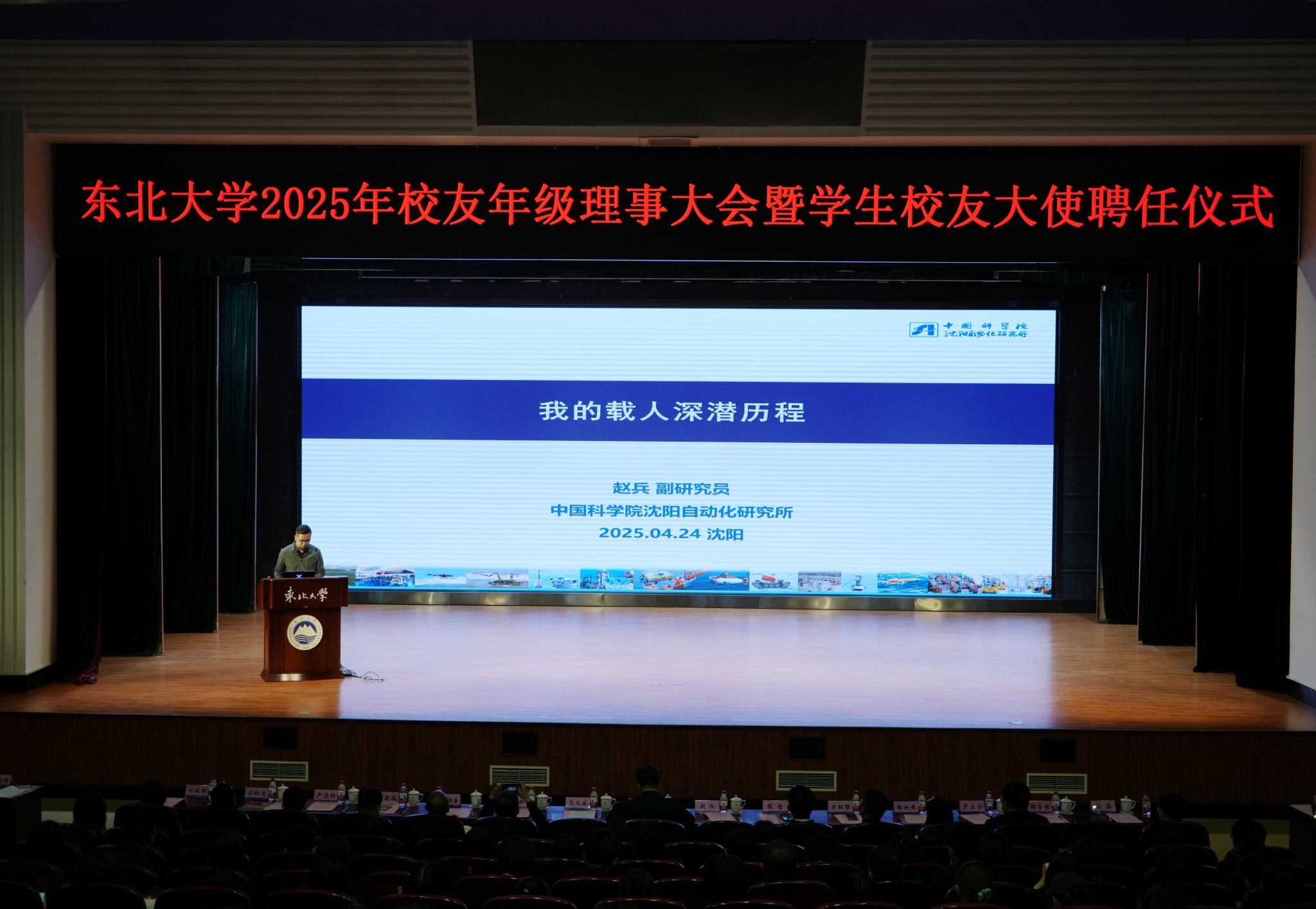 4月24日,在东北大学建校102周年前夕,“启航·东大未来”东北大学2025年校友年级理事大会暨学生校友大使聘任仪式在汉卿会堂蔡冠深报告厅举行。校党委副书记张皓,“奋斗者”号万米载人潜水器控制软件负责人、主驾驶试航员赵兵校友,学校相关部门负责人、学院学生工作负责人,以及2025年校友年级理事暨校友大使全体成员出席仪式。