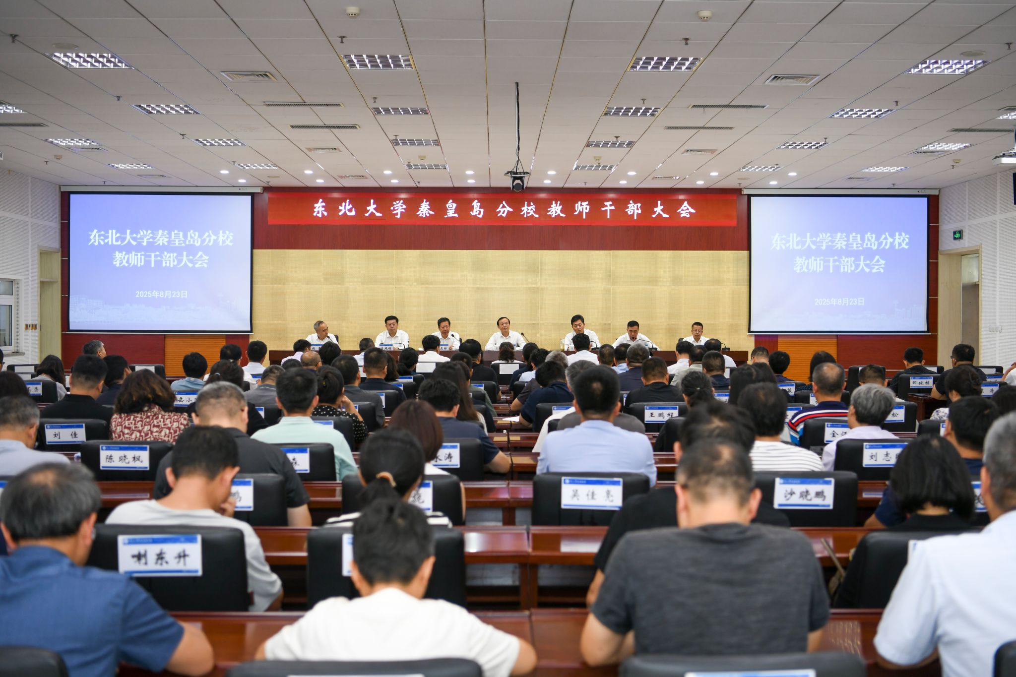 8月23日下午,东北大学秦皇岛分校召开教师干部大会。秦皇岛市委常委、组织部部长、统战部部长张振锋,市委教育工委书记、教育局局长肖凤利,东北大学党委书记郭海、党委常委姜玉原出席会议。秦皇岛分校领导班子成员、中层干部、教授代表、市级以上“两代表一委员”、民主党派负责人、教代会执委、离退休教师代表等参加会议。秦皇岛分校校长赵勇主持会议。