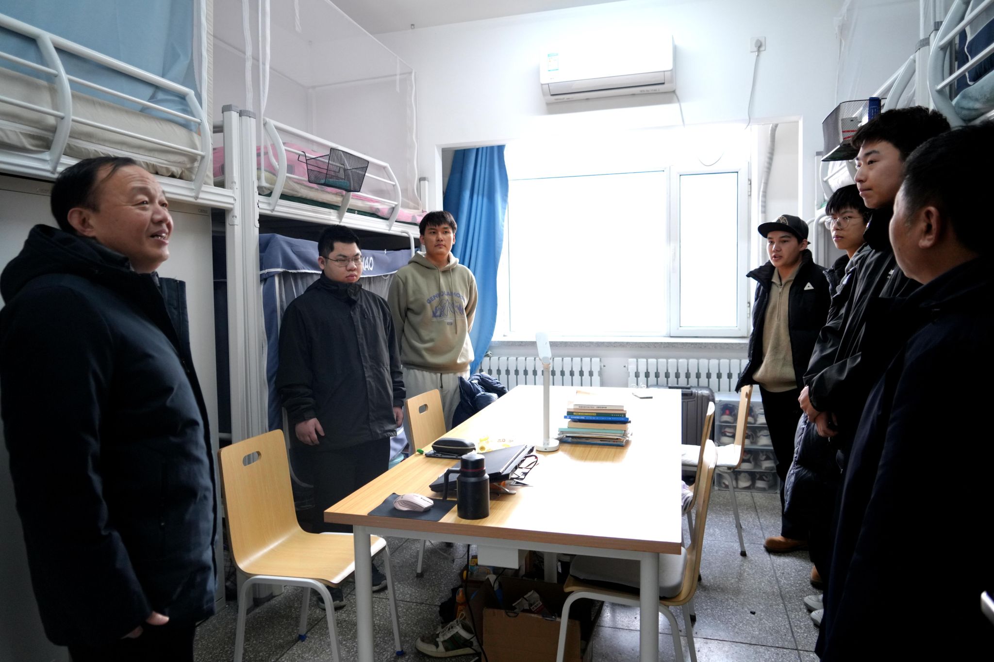 郭海、王辉走访慰问了学生宿舍,看望了留校学生与留学生代表,深入了解了学生寒假留校的学习和生活状况,详细询问了宿舍生活设施的配备情况,为同学们送上新春祝福和暖心礼包,叮嘱同学们合理安排好学习和生活,度过一个安全、充实的假期。