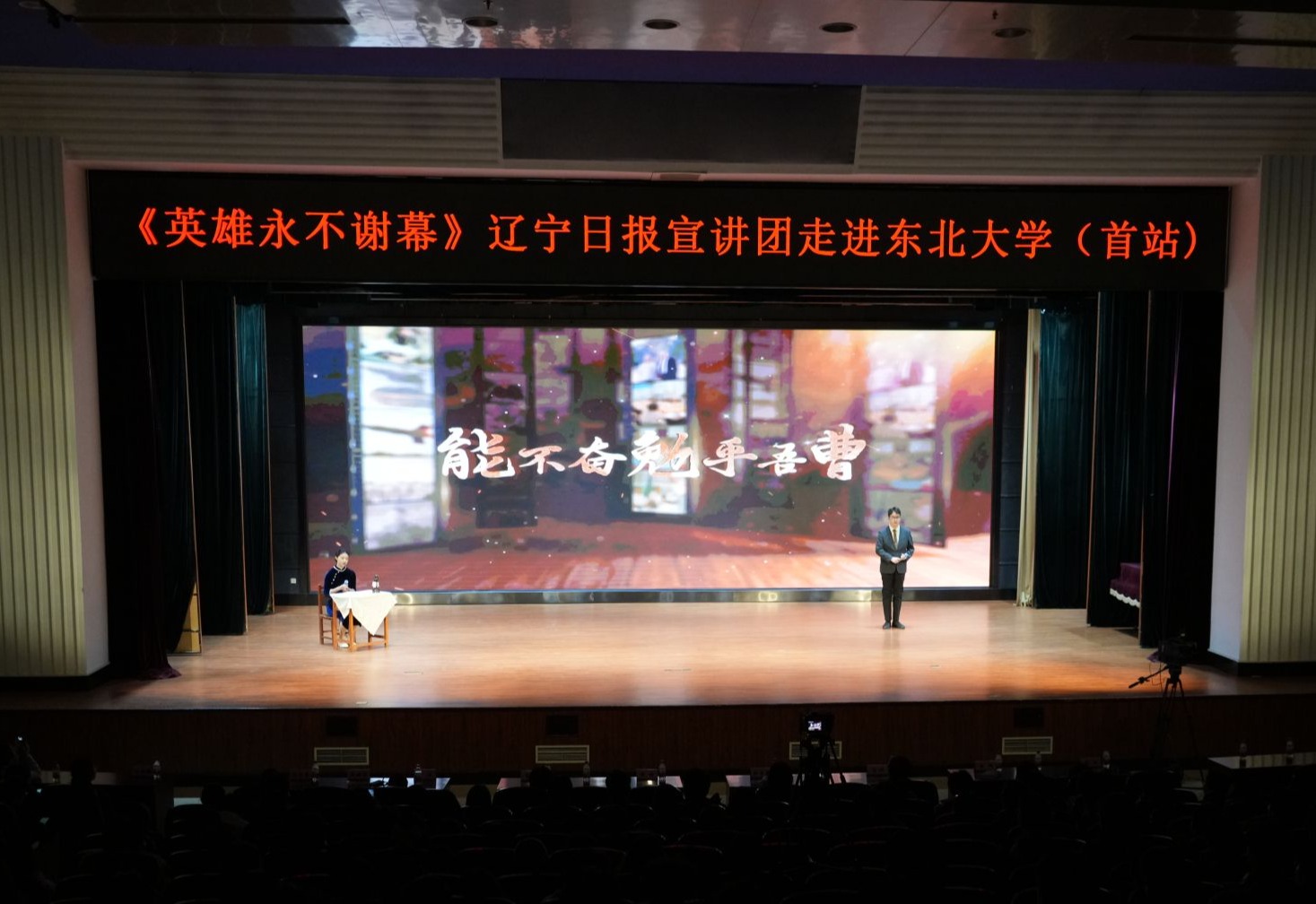 活动在东北大学材料科学与工程学院、外国语学院和冶金学院学生共同演绎的情景朗诵《松花江上》拉开帷幕;由辽宁日报拍摄的主题短片《宣言》跨越时空,再现峥嵘岁月。在历史与现实交织的光影画面中,辽宁日报宣讲团成员孙明慧、黄瀚博、栾溪、高爽依次登台,以初心为笔、以信仰为墨,为现场师生带来了4个不同主题的宣讲,从不同维度解锁英雄精神的时代内涵与精神密码。