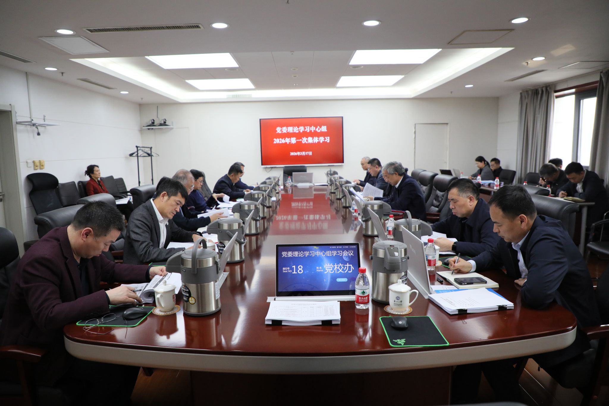 3月17日,东北大学在主楼1415室召开党委理论学习中心组集体学习会议,专题传达学习习近平总书记在2026年全国两会期间的重要讲话精神和政府工作报告、《中华人民共和国国民经济和社会发展第十五个五年规划纲要》的主要内容,特别是关于教育、科技、人才工作的战略部署。校党委书记郭海作会议领学和学习总结。校长冯夏庭作重点发言。学校领导班子成员、党委委员参加学习。